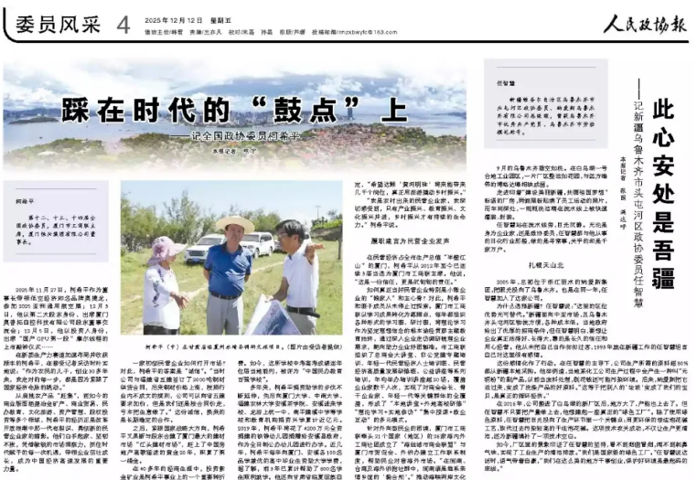 【人民政協(xié)報(bào)】2025年12月12日,人民政協(xié)報(bào)專(zhuān)訪(fǎng)柯希平文章《踩在時(shí)代的“鼓點(diǎn)”上》,刊登于第4版“委員風(fēng)采”欄目,照寧記者手記《致敬民營(yíng)企業(yè)家,致敬奮斗者》同步刊登。柯希平:第十二、十三、十四屆全國(guó)政協(xié)委員,廈門(mén)市工商聯(lián)主席,廈門(mén)恒興集團(tuán)有限公司董事長(zhǎng)。2025年11月27日,柯希平作為董事長(zhǎng)帶領(lǐng)低空經(jīng)濟(jì)知名品牌奧捷龍,參加2025亞洲通用航空展;12月3日,他以第二大股東身份,出席廈門(mén)奧普拓自控科技有限公司股東董事交流會(huì);12月5日,他以投資人身份,出席“國(guó)產(chǎn)GPU第一股”摩爾線(xiàn)程的上市敲鐘儀式……在新質(zhì)生產(chǎn)力賽道加速布局并收獲頗豐的柯希平,在接受記者采訪(fǎng)時(shí)樸實(shí)地說(shuō):“作為農(nóng)民的兒子,創(chuàng)業(yè)30多年來(lái),我走對(duì)的每一步,都是因?yàn)榫o跟了國(guó)家經(jīng)濟(jì)命脈的跳動(dòng)?!睆募缣艮r(nóng)產(chǎn)品“趕集”,到如今的商業(yè)版圖涵蓋冶金礦產(chǎn)、商業(yè)貿(mào)易、民辦教育、文化旅游、資產(chǎn)管理、股權(quán)投資等多個(gè)領(lǐng)域,柯希平的經(jīng)歷正是改革開(kāi)
